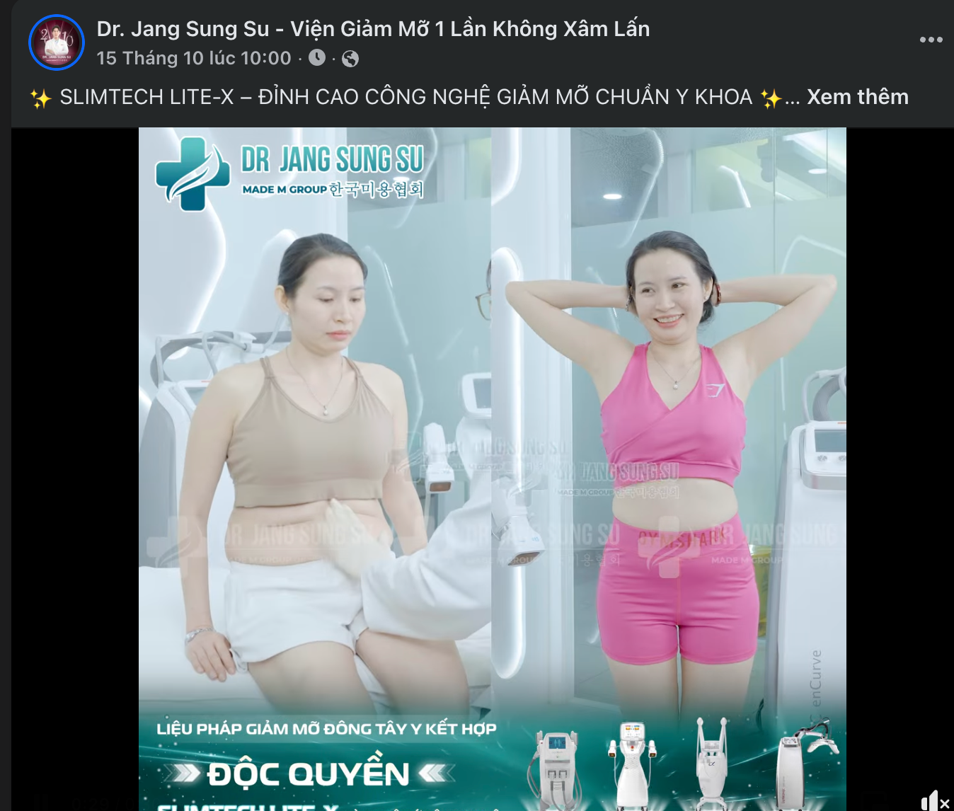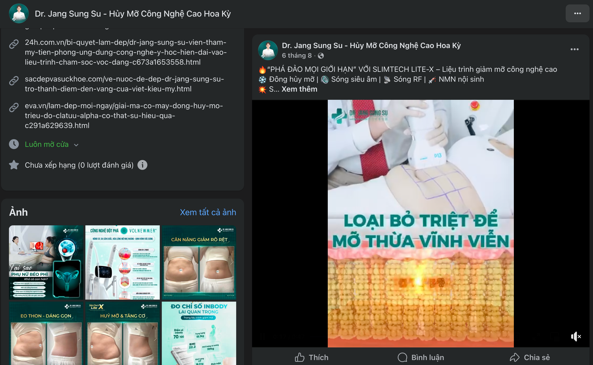 Trước khi bị xử phạt, trên mạng xã hội xuất hiện nhiều fanpage có tên “Dr. Jang Sung Su – Huỷ mỡ công nghệ cao Hoa Kỳ”; “Dr. Jang Sung Su – Giảm béo không xâm lấn”; “Dr. Jang Sung Su – Viện giảm mỡ 1 lần không xâm lấn”;… thường xuyên đăng tải nội dung quảng cáo “giảm béo thần tốc”, cam kết giúp khách hàng “giảm 10–15 kg mỡ thừa” chỉ sau vài buổi liệu trình. Các trang này đều hướng người tiêu dùng quan tâm đến địa chỉ 72D Trần Quốc Toản, phường Xuân Hòa – nơi đặt trụ sở của Strong Medical Center.