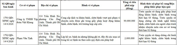 Với hành vi cung cấp dịch vụ khám chữa bệnh vượt quá phạm vi chuyên môn, công ty TNHH Tập đoàn Việt Khang (114 Trần Đình Xu, phường Cầu Ông Lãnh, TP.HCM) bị phạt 90 triệu đồng và tước quyền sử dụng giấy phép hoạt động KCB trong 3 tháng; người chịu trách nhiệm chuyên môn của cơ sở này cũng bị tước chứng chỉ hành nghề KCB 2 tháng.