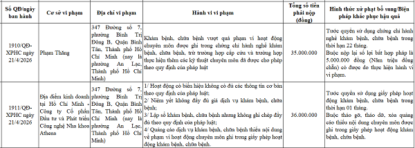 Ngoài ra, Sở Y tế TP.HCM xử phạt cơ sở kinh doanh của Công ty cổ phần đầu tư và phát triển công nghệ nha khoa Athena (đường số 7, phường An Lạc) 36 triệu đồng vì vi phạm về quảng cáo, niêm yết giá, lập sổ khám bệnh; đồng thời tước quyền sử dụng giấy phép hoạt động 1 tháng; buộc xóa quảng cáo.