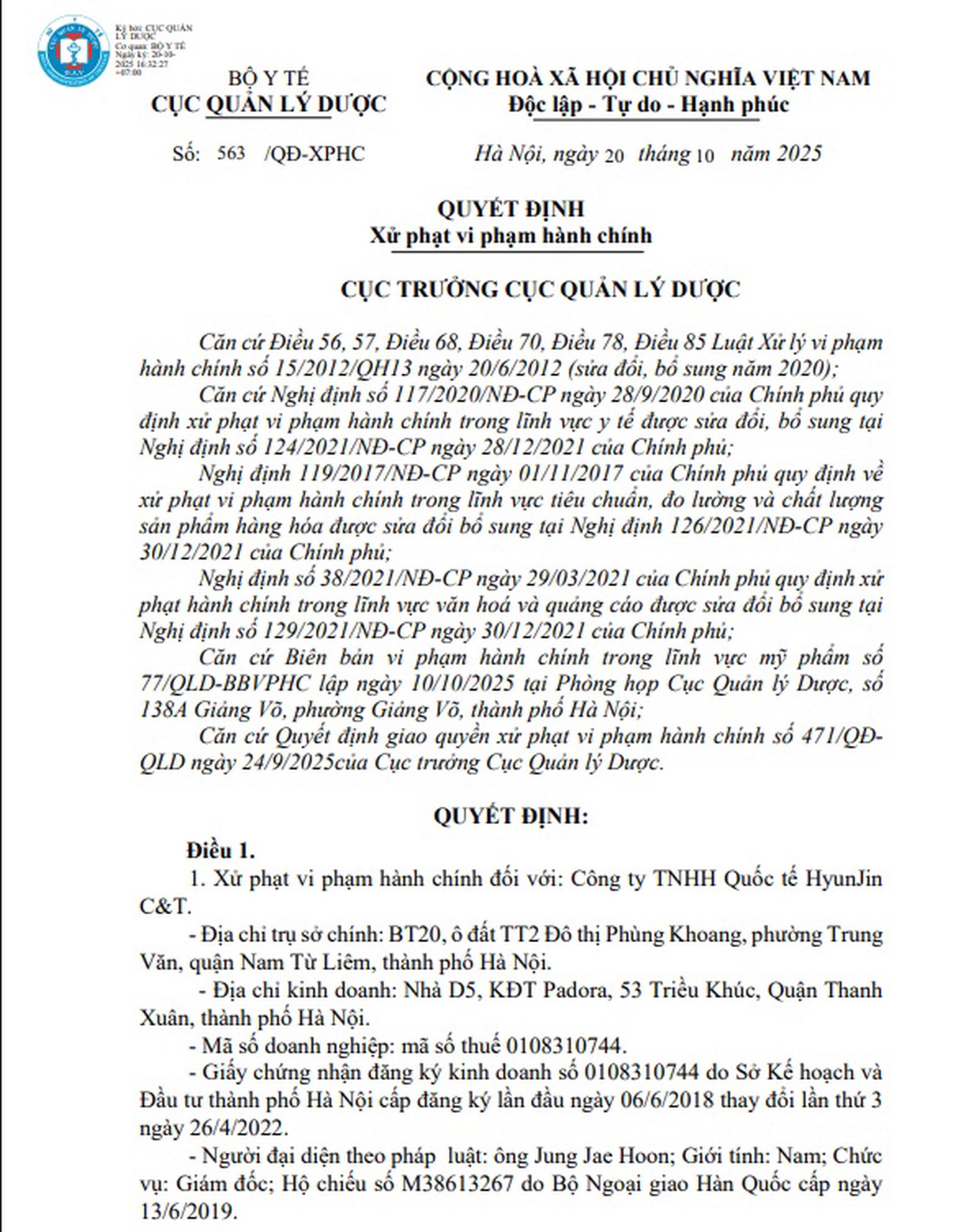 Quyết định xử phạt của Cục Quản lý Dược đối với Công ty TNHH Quốc tế HyunJin C&T. Ảnh: Cục Quản lý Dược
