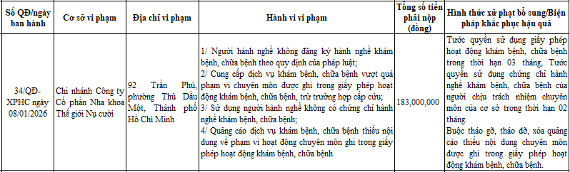 Cụ thể, chi nhánh Công ty cổ phần nha khoa Thế giới Nụ cười (phường Thủ Dầu Một) bị xử phạt 183 triệu đồng. Cơ sở này vi phạm nhiều hành vi: người hành nghề không đăng ký; cung cấp dịch vụ khám chữa bệnh vượt quá phạm vi chuyên môn; sử dụng người không có chứng chỉ hành nghề khám chữa bệnh; quảng cáo dịch vụ khám chữa bệnh thiếu nội dung về phạm vi hoạt động chuyên môn.