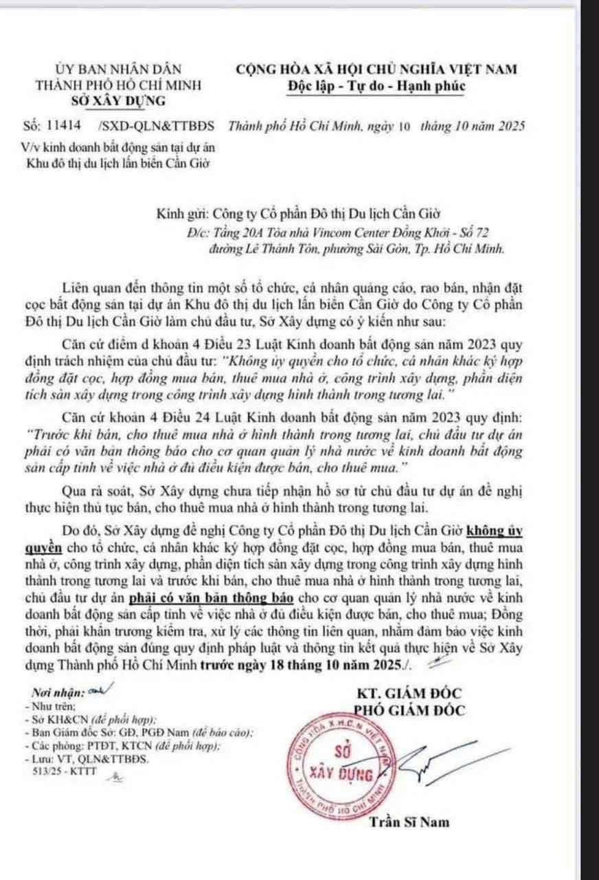Ngày 10/10/2025, Sở Xây dựng TP.HCM đã có công văn số 11414 đề nghị Công ty Cổ phần Đô thị Du lịch Cần Giờ không ủy quyền cho tổ chức, cá nhân khác ký hợp đồng đặt cọc, hợp đồng mua bán, thuê mua nhà ở, công trình xây dựng, phần diện tích sản xây dựng trong công trình xây dựng hinh thành trong tương lai và trước khi bản, cho thuê mua nhà ở hinh thành trong tương lai tại dự án Khu đô thị du lịch lấn biển Cần Giờ.