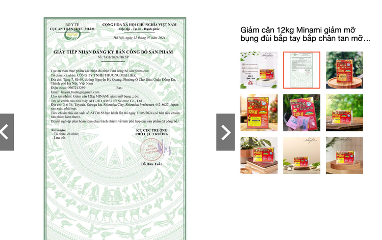 Cụ thể, sản phẩm "Giảm cân 12kg MINAMI giảm mỡ bụng" do Công ty TNHH Thương mại HKK (địa chỉ tầng 7, số 69 Nguyễn Huy Quang, Hà Nội) đứng tên, có số công bố 5438/2024/ĐKSP ngày 12-7-2024; tuy nhiên qua tra cứu, Cục chưa từng cấp giấy tiếp nhận cho sản phẩm này.